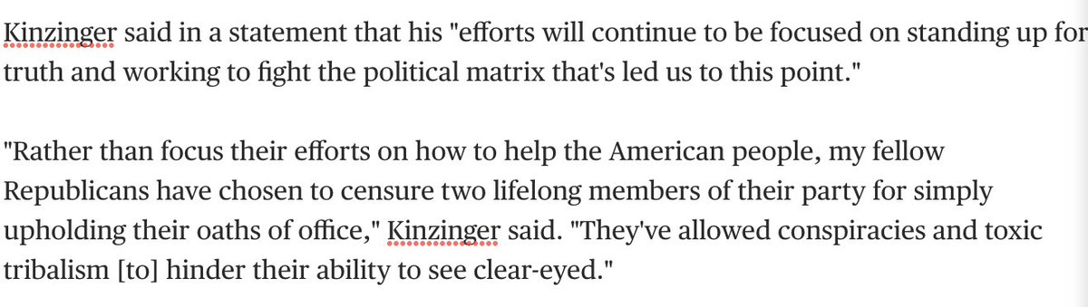 "... my fellow Republicans have chosen to censure two lifelong members of their party for simply upholding their oaths of office. They've allowed conspiracies and toxic tribalism [to] hinder their ability to see clear-eyed."