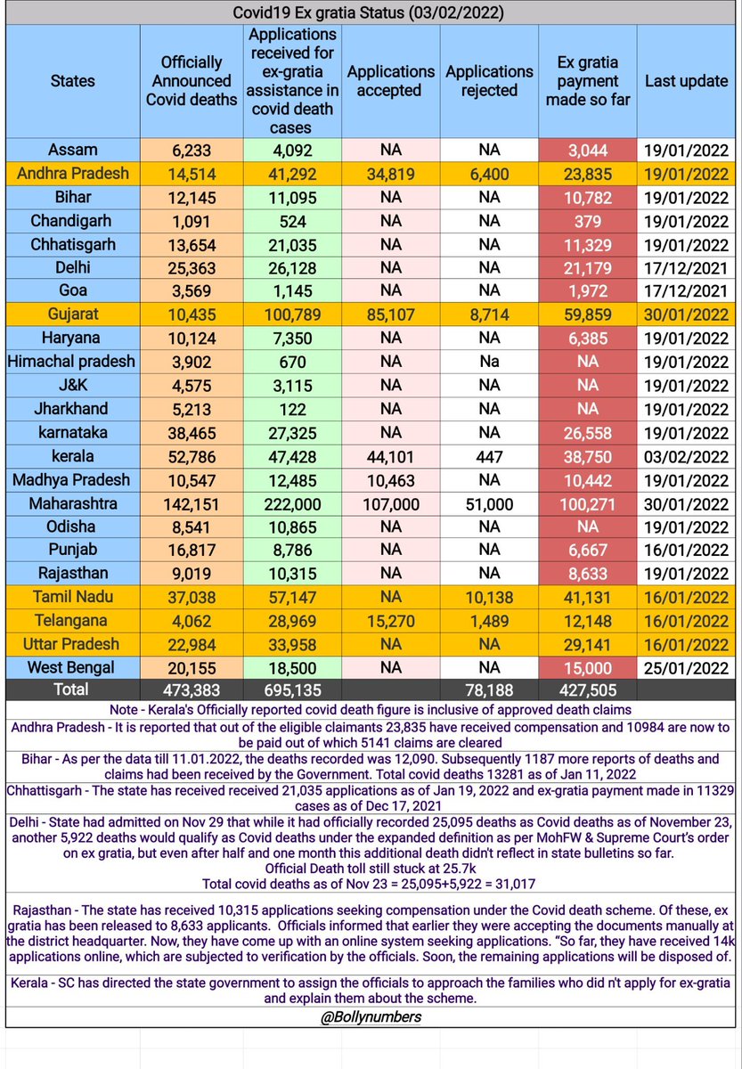 That some of these states have hugely under-reported the deaths is obvious from the fact they have approved #COVID19 ex-gratia compensation claims many times higher than their officially recorded deaths. Table by @BollyNumbers.