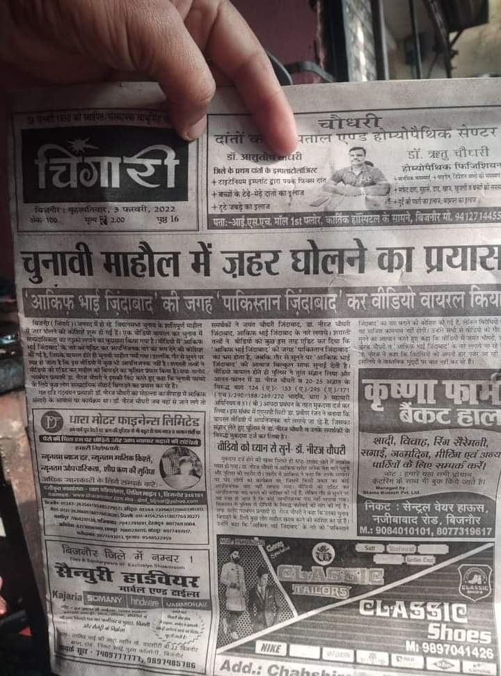 बिजनौर विधान सभा से राष्ट्रीय लोकदल पार्टी से डॉक्टर नीरज चौधरी चुनाव लड़ रहे हैं । डॉक्टर नीरज चौधरी जाट बिरादरी से हैं । उनके ख़िलाफ़ एक FIR दर्ज हुई है कि उन्होंने एक गाँव में पाकिस्तान ज़िंदाबाद के नारे लगवाए हैं । 3/1
