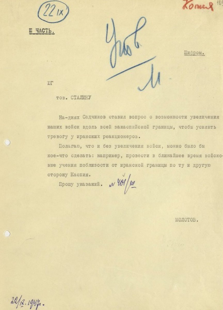 An interesting historical document. Soviet Ambassador in Iran proposes to build up Soviet forces at the Iranian-Soviet border "to raise alarm among Iranian reactionaries." Molotov suggests to Stalin that they could just carry out military exercises in the border area.