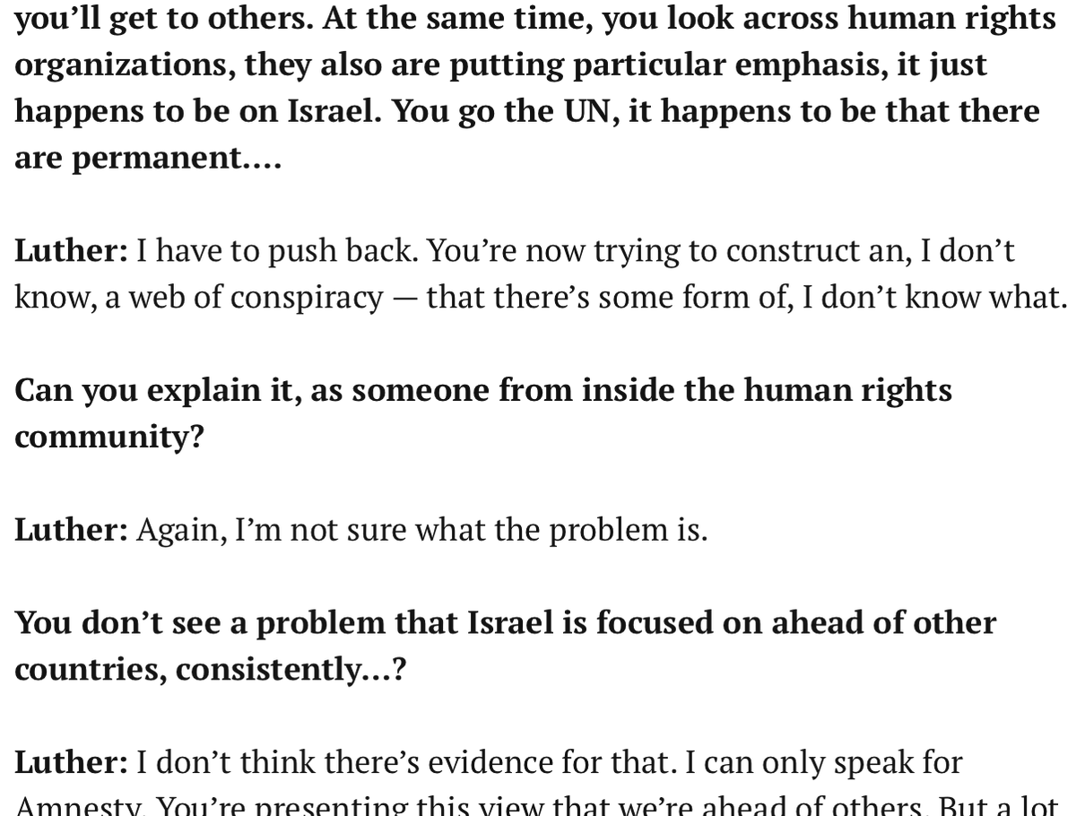 This absolute car crash of an interview by @AgnesCallamard & @philipluther makes for an instructive read. Remember, they weren’t ambushed on some obscure topic, but asked a few simple questions on the very thing they flew out here to present. timesofisrael.com/amnesty-to-toi…