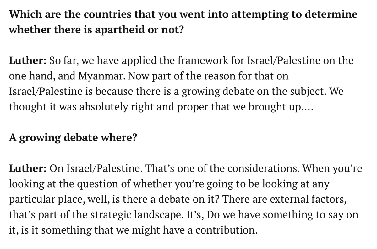 And that’s the point of redefining apartheid especially for Israel too (something all three reports, which claim to be based on “international law” but none of which use the actual legal definition of apartheid, and each of which invents another unique one): ...