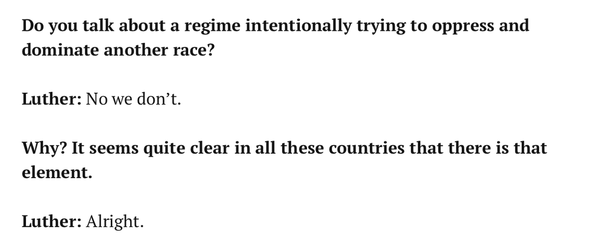 Remember, the conversation is taking place because of an allegation of racist practices, yet Luther treats the question of eagerness to pursue one group and not another as impertinent. @Lazar_Berman is “hung up on the idea” that is “somehow so important,”...