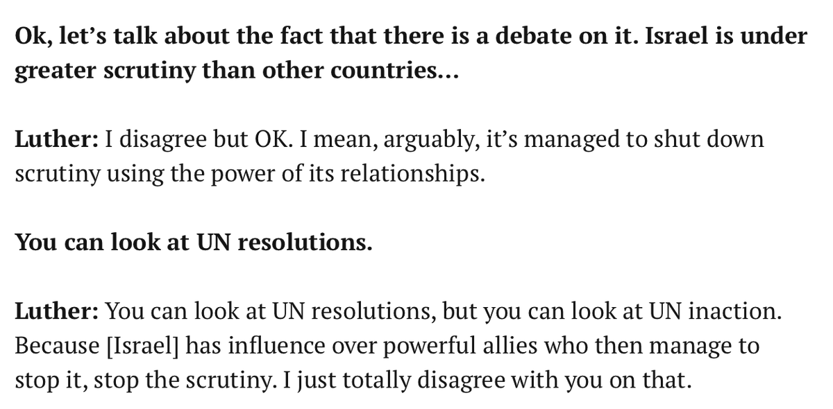 Throughout Luther goes back and forth, either denying that there is an outsized focus on Israel to petulantly insisting that it is entirely justified.
