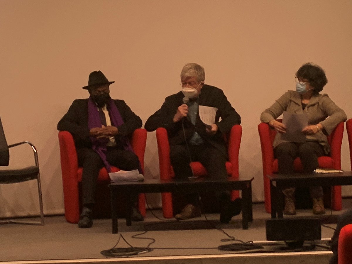 3/ Sur scène avec Jacques Martial, les institutions réunies ce soir pour célébrer la mémoire de Marcel Dorigny : Dominique Taffin (pour la FME), @guillaumevial10 (@sfhomoutremers), Lionel Trani (@AssoPECE), José Pentoscrope (@CIFORDOM)