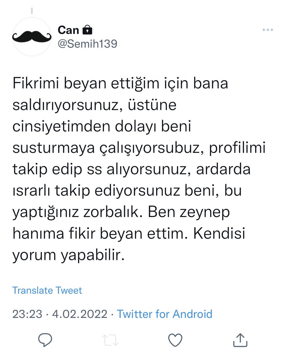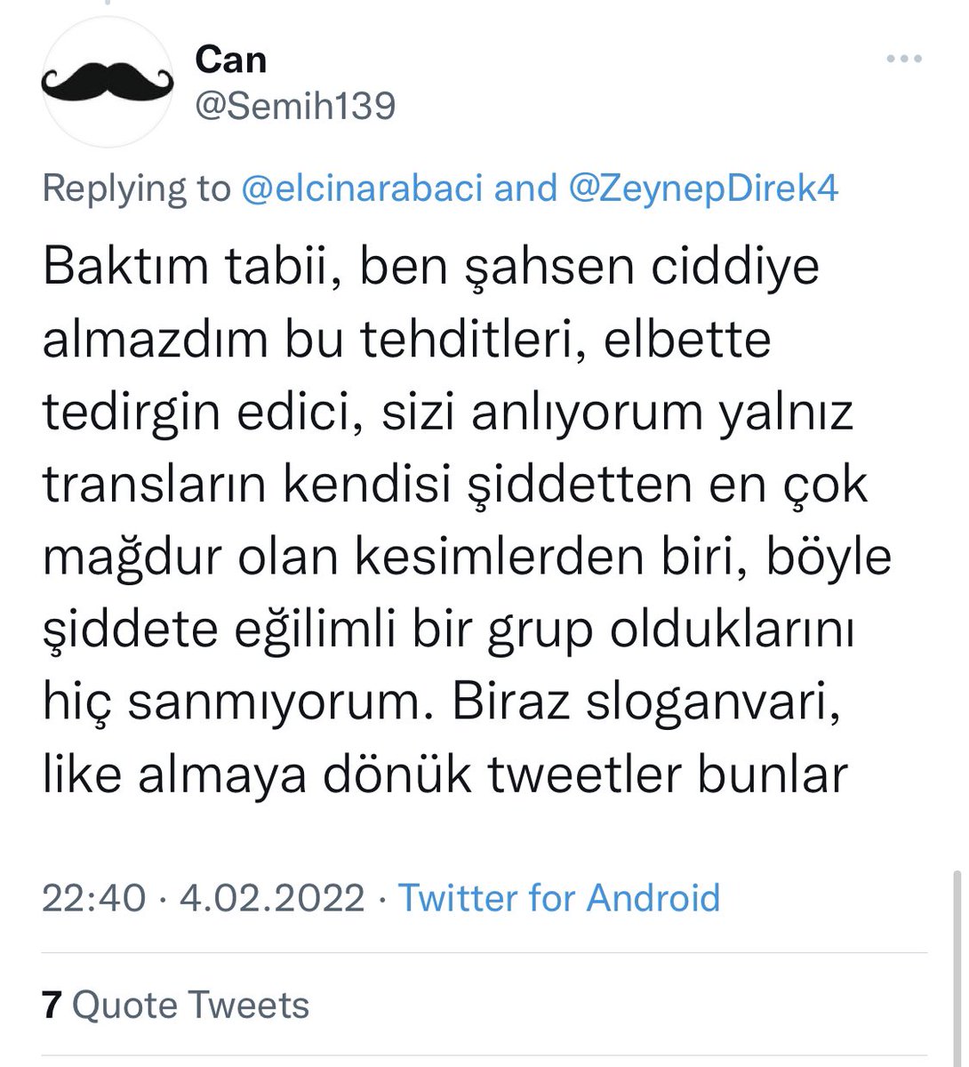 Bu tweetten sonra, 10 dk önce profil fotonuzu değiştirmişsiniz @Semih139 . Ne oldu TERFler şiddetle mi tehdit etti, nedir? :D Kendinize biçtiğiniz "kadınlara yönelik şiddet otoritesi" kimliğinize yakışmış, isabet olmuş bıyık. :)
