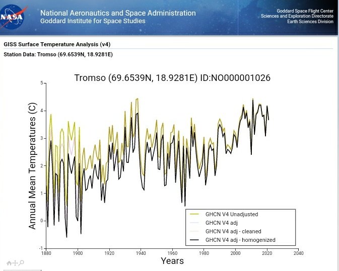 Tromso, northern Norway. Should have adjustments to cool the recent due to significant UHI effect (BI of 89), yet the past is cooled to manufacture warming.