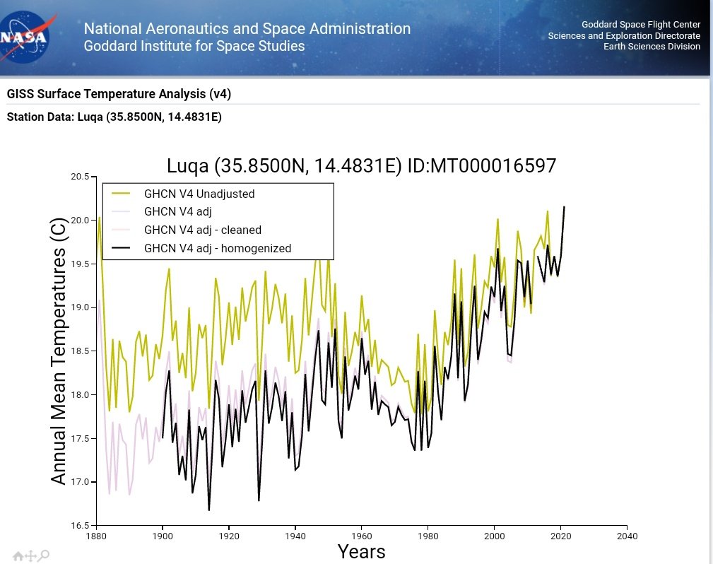 Massive adjustments to cool the past and remove multi-decadal variability in Luqa, Malta (BI 33 = recent uptick is UHI effect).