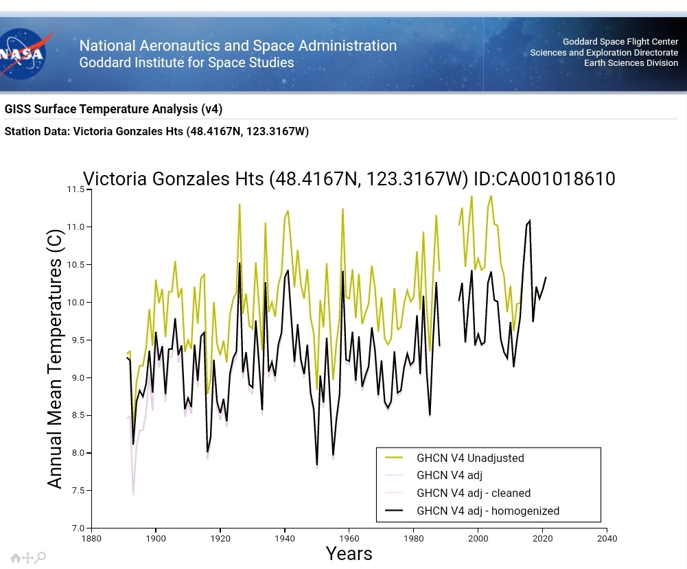 Victoria Gonzales Heights, Canada, no warming prior to adjustments: