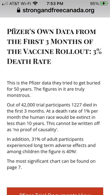 Dit zijn eigen gegevens van Pfizer van de eerste 3 maanden van de introductie van het vaccin: 3% sterftecijfer. Dit zijn de Pfizer-gegevens die ze 50 jaar lang probeerden te begraven. De cijfers zijn werkelijk monsterlijk. strongandfreecanada.org/facts-and-data…