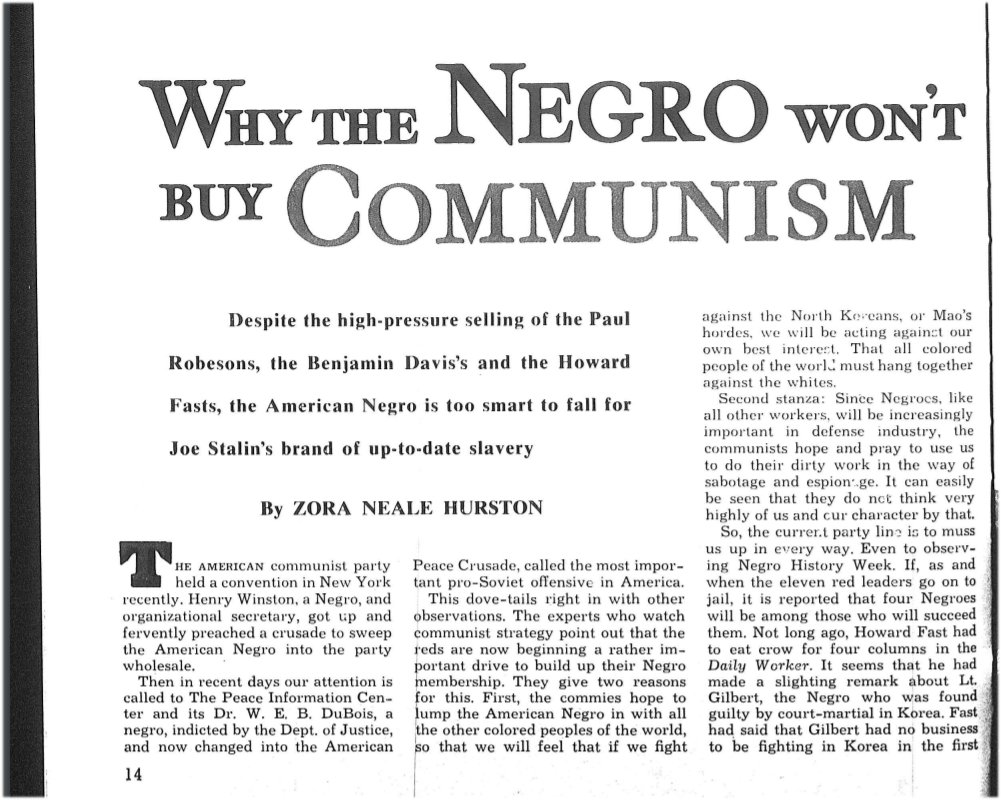 In particular, see Hurston's assessment of W.E.B. Du Bois, who she basically called him a Kremlin stooge. The distance between her and NHJ on economic matters could not be further apart.