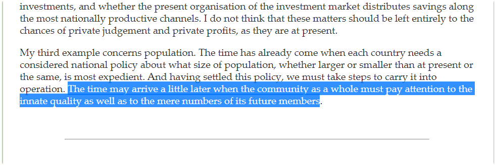 Our story starts in 1926 when Keynes wrote one of his most famous essays, 'The End of Laissez Faire.' Close readers of this essay are also familiar with a notorious passage where Keynes endorses eugenics as a basis for population management.