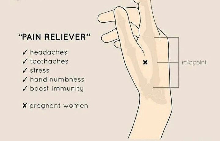 AKUPRESUR AKUPUNKTUR NOKTALARI ILE SIKINTILARI AZALTMA 1. Baş ağrısı, diş ağrısı, boyun ağrısı, stresi azaltmak, bağışıklığı artırmak için. Hamileler yapmamalıdır. Elin baş parmağı ile işaret parmağı arasında perdenin 2 cm altı 2 kemik arası. (Resim1, Resim 2)