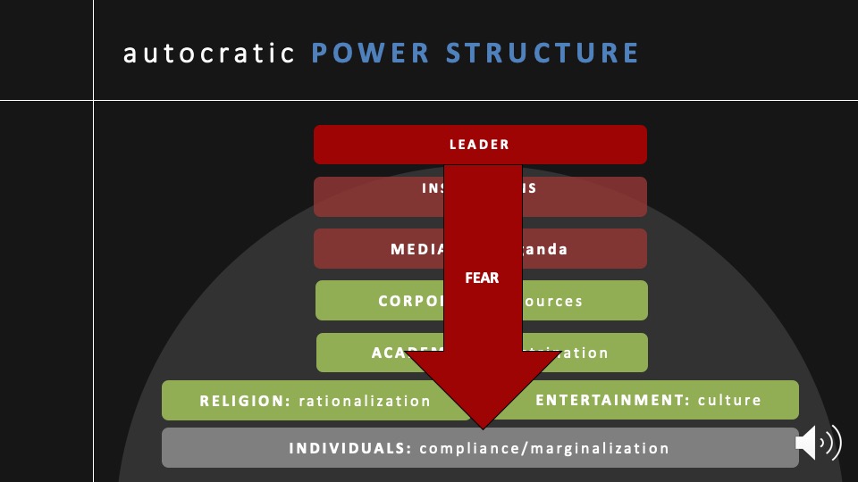 Autocratic power is vertical. It flows from the leader at the top, through a small cadre (usually family or business associates) downward through outrage complexes, connected enablers, wannabes, loyal institutional officials & the self-interested on to the citizens.