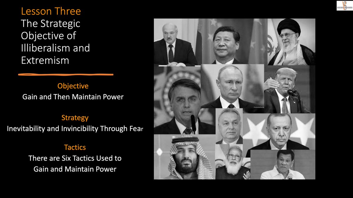 There are 6 tactics for implementing this strategy. I witnessed them working against autocrats worldwide. They are 1) Big Ideas/Big Lies 2) Marginalization 3) Dependency 4) Disinformation 5) Divide & Conquer 6) Threats, Repression & Violence.