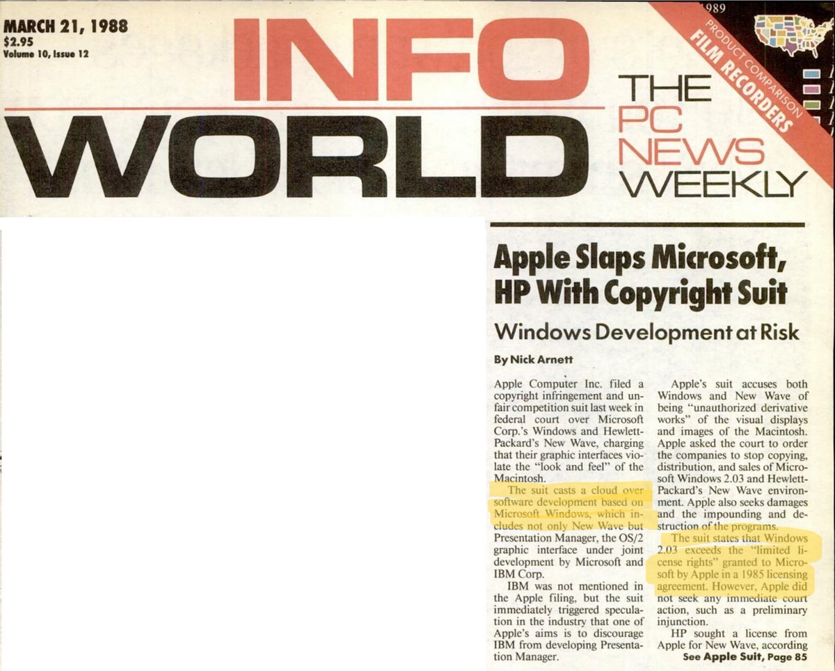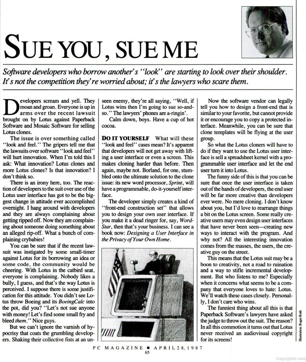 2/ Pressure on Microsoft started early 90s. Perhaps owing to Bill Gates’ upbringing, he was both comfortable with litigation and also good at compartmentalizing it to the main actors. Legal stuff goes far back. Apple suing MS was first I recall. Lotus sued over “look and feel”.