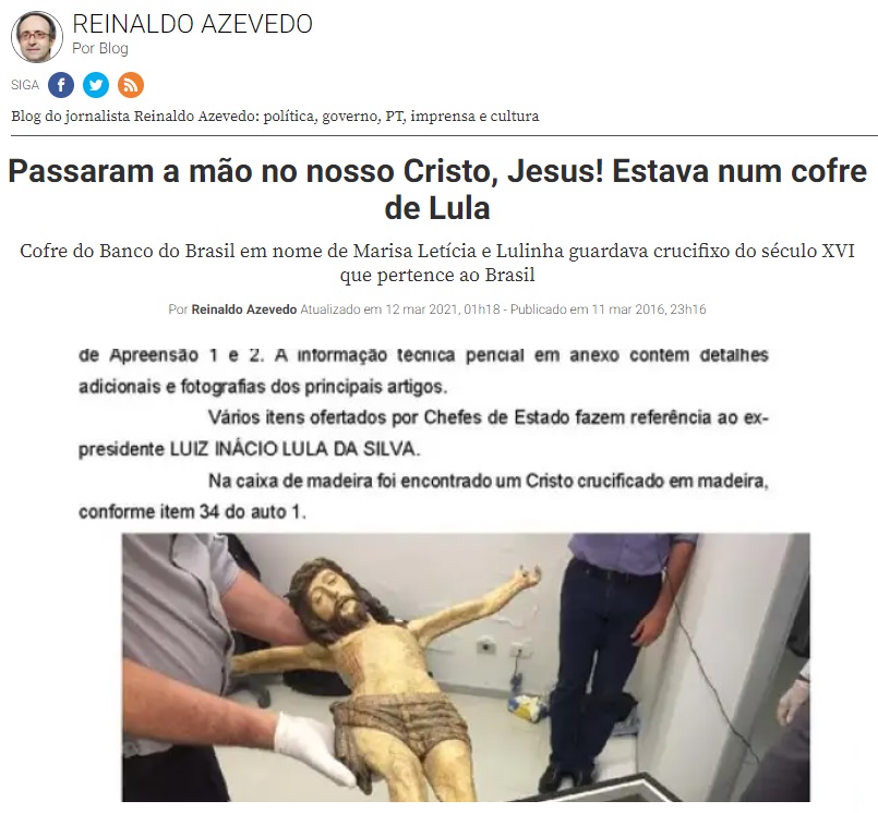 Empolgado, Reinaldo Azevedo se apressou em acusar Lula de "passar a mão" em um "crucifixo entalhado em madeira, datado do século XVI, que pertence ao estado brasileiro".