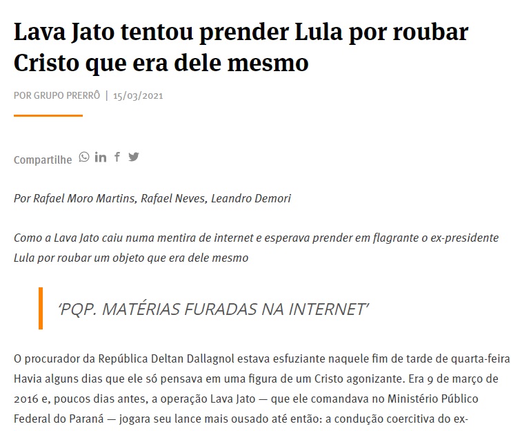 A alegria durou pouco. Cinco dias após a descoberta do crucifixo, Deltan foi informado pelo procurador Januário Paludo que a Lava Jato havia caído em uma fake news de Whatsapp. O crucifixo era de Lula e a informação podia ser verificada com uma simples pesquisa no Google.