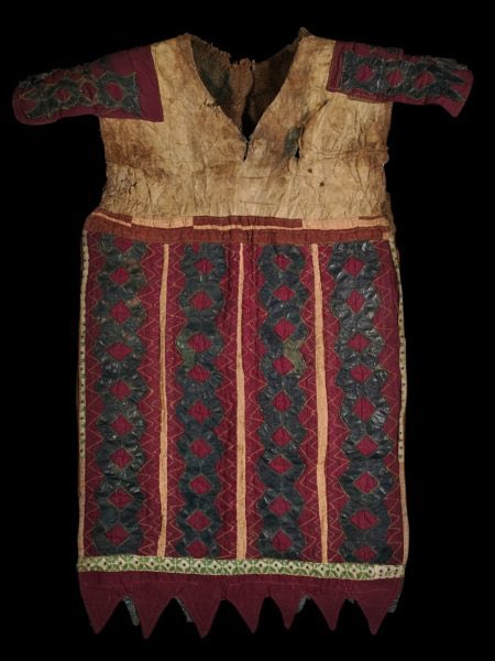 The double-sided tunic is of deep-red cotton cloth over-sewn with goat-leather panels in columns of double zig-zags & yellow cotton also in zig-zags.