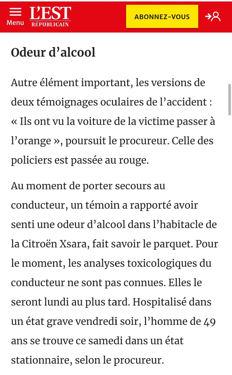 Premiere constatation. Le chauffeur du véhicule est en arrêt cardiorespiratoire. Il est entre la vie et la mort. Les policiers sont choqués (d'après leur témoignage). Les faits sont clairs: la voiture de la police est passée au rouge et a foncé dans cette voiture