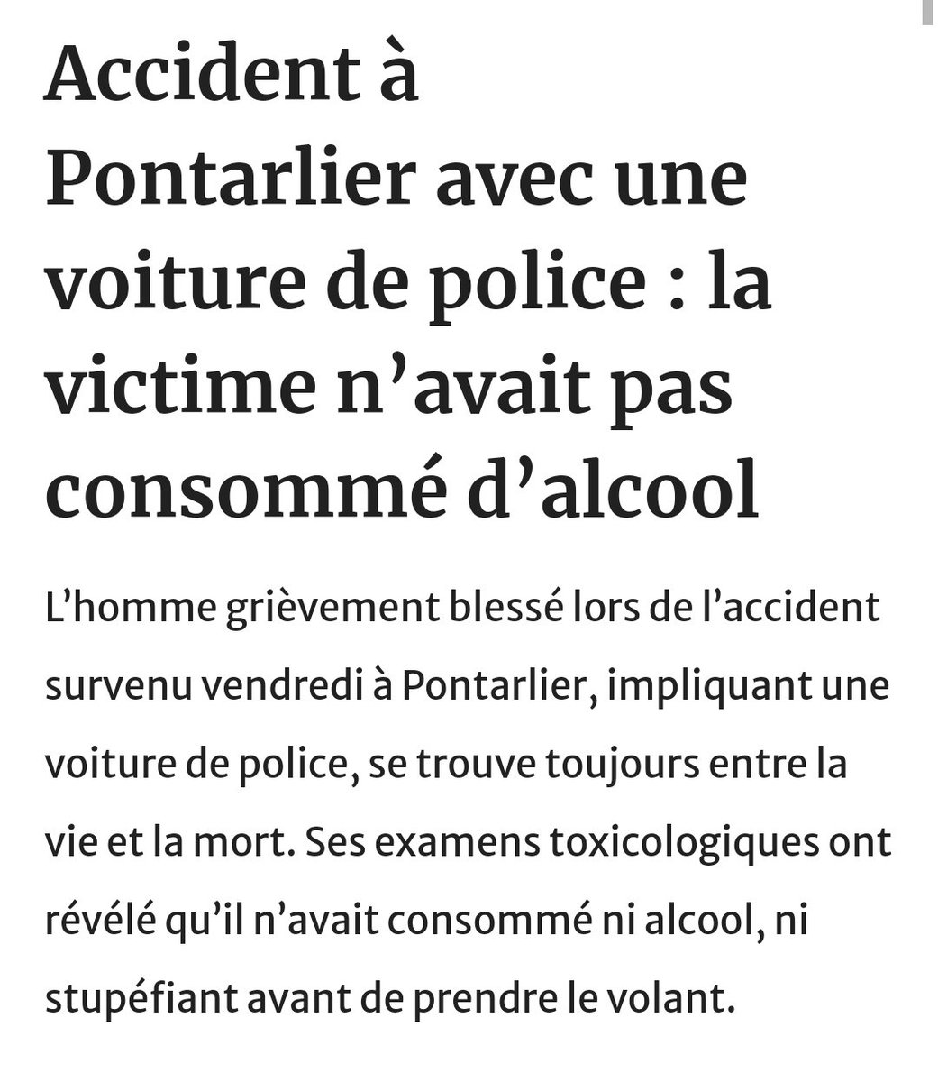 Aujourd'hui, les résultats toxico et alcoolémie sont tombés. Non, la victime (toujours dans un état grave) n'avait pas bu, ni pris de la drogue. Un peu tard, le mal est fait et dans l'imaginaire collectif, la police n'a rien fait de mal et la victime aurait bu et grillé le feu