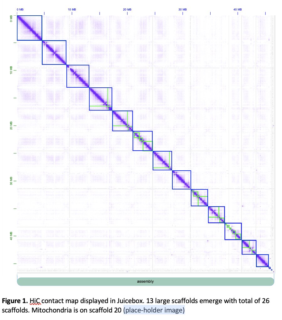 This is the HiC map that organized the 32 contigs of the 1st genome release into 13 chromosomes, Mito and a few small contigs.