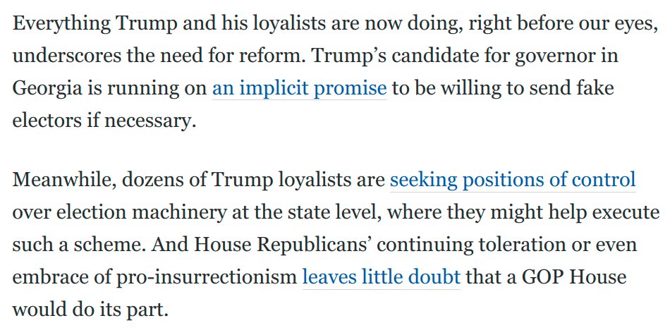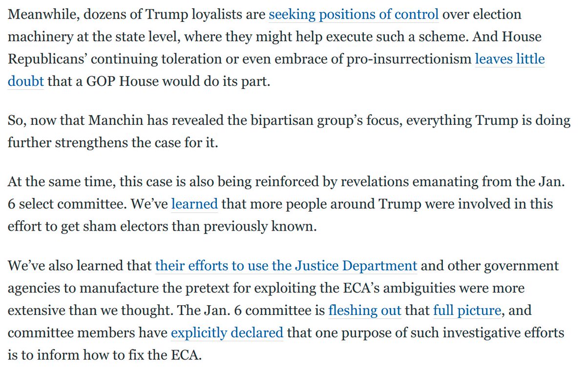 Trump's ugly admissions of guilt over 1/6 are clarifying. Because he's flaunting his corrupt designs, opposing reform of the Electoral Count Act is now firmly aligned with making a 2024 coup easier.
