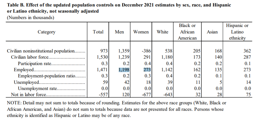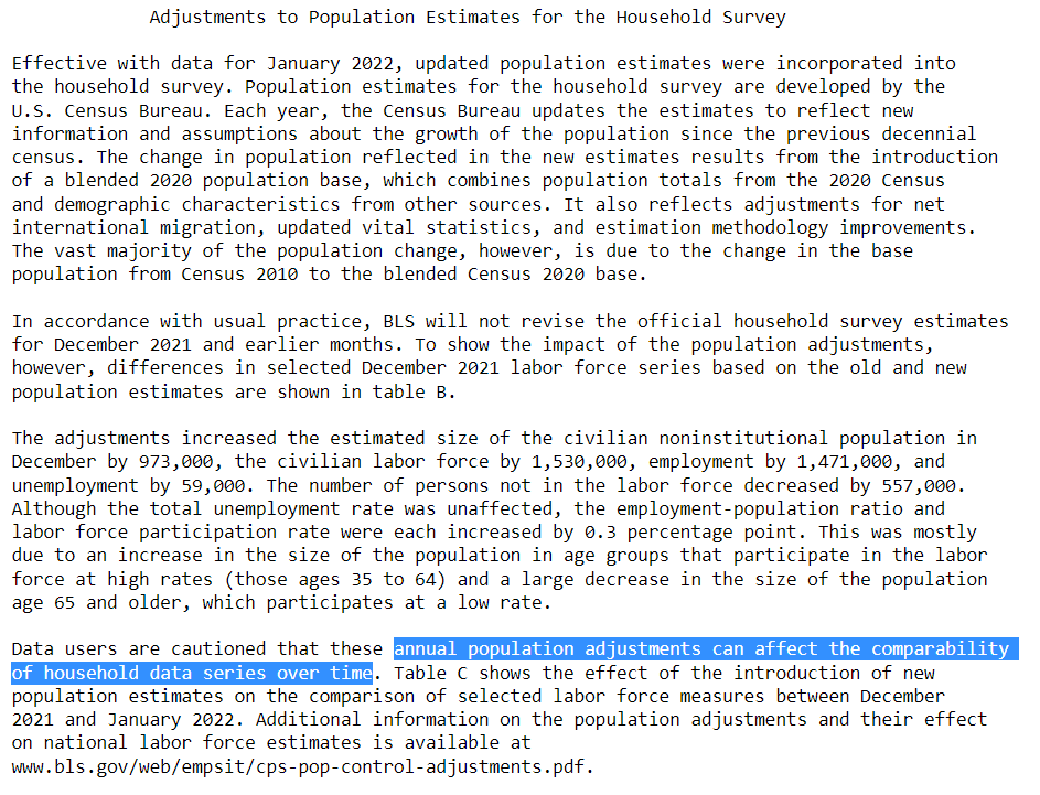 Longer version: Our employment numbers come from surveys. Those surveys must be weighted to reflect the population. January's numbers use different weights than December's, so they can't be directly compared. Here's the BLS: bls.gov/news.release/a…