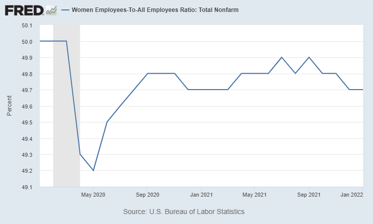 So the entire differential rise in employment by gender in January is a statistical artefact. You can also see this in a separate survey (the firm survey), which did not make the same adjustment, and which shows no change in January in the share of jobs held by women.