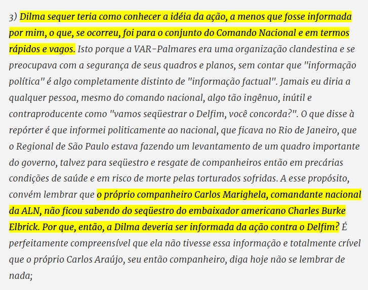 "O que disse à repórter é que informei (...) que o Regional de SP estava fazendo um levantamento de um quadro importante do governo, talvez para sequestro e resgate de companheiros então em precárias condições de saúde", afirmou o ex-guerrilheiro.