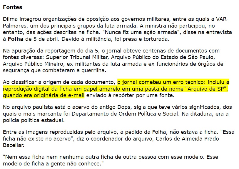 O jornal admitiu ter mentido sobre a origem da ficha policial falsa utilizada para ilustrar a matéria, atribuindo a desinformação a um "erro de catalogação". Ao contrário do que disse a Folha, a ficha não foi obtida junto ao Arquivo Público de São Paulo.