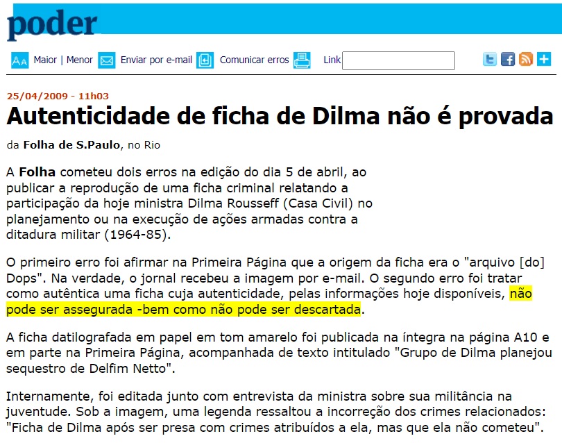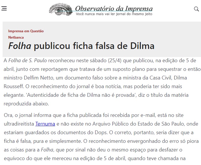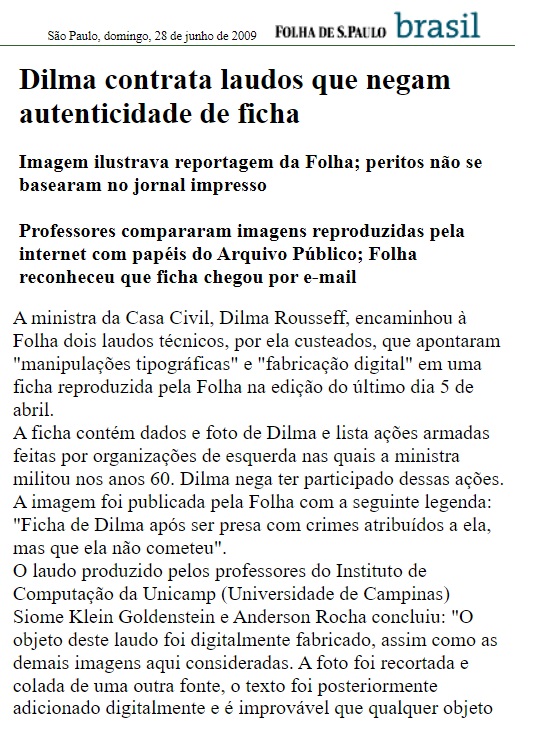 Jornalismo de qualidade exige mais do que recursos. E o Grupo Folha, que tem um faturamento anual de mais de 2,7 bilhões de reais, é prova disso. Em 5 de abril de 2009, a Folha de S. Paulo estampou em sua capa uma ficha policial falsa atribuída a Dilma Rousseff.