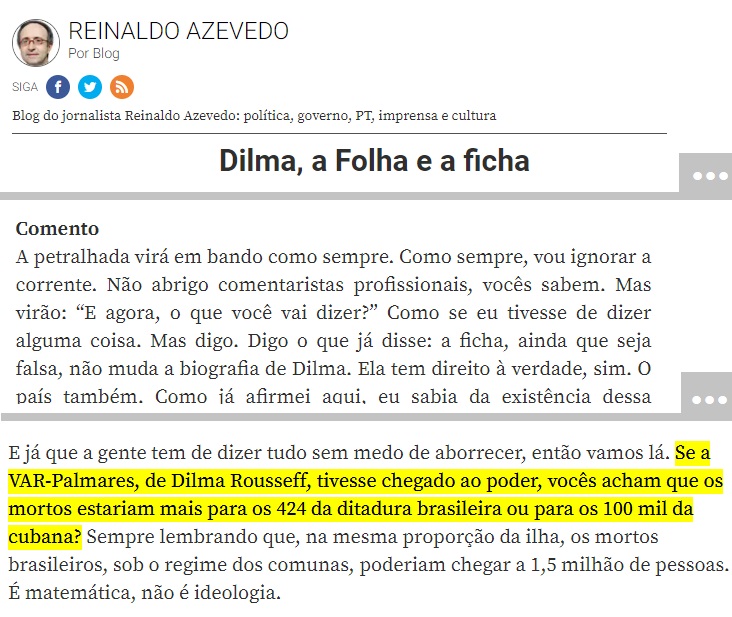 A imprensa reagiu com o habitual corporativismo, ignorando a polêmica. Na Veja, Reinaldo Azevedo, tratou de contemporizar e ao mesmo tempo inflamar, dizendo que se a VAR-Palmares de Dilma chegasse ao poder, milhões morreriam. "É matemática, não é ideologia", assegurou.