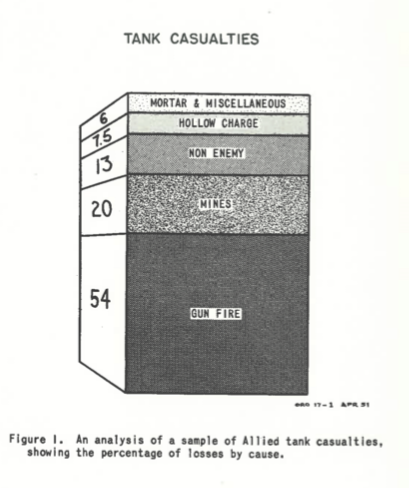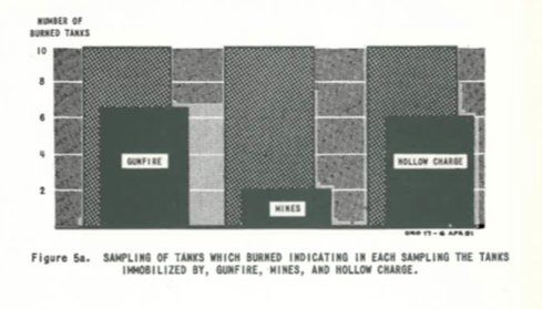 Causes of burned out tanks once hit were attributed to 65% gunfire, 61% hollow charges and 21% mines.