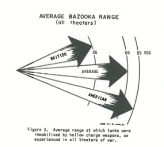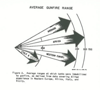 A study of the average range at which tanks were knocked out by gunfire indicated 785 yards (717metres/0.7Km). Hollow charges averaged 50 yards. This is in theatres.