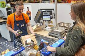 Ce concept unique est probablement le plus étonnant chez Colruyt. Arrivé à la caisse, pas de tapis roulant où mettre ses articles. Le caissier vous attend debout, avec un caddie vide à ses côtés.