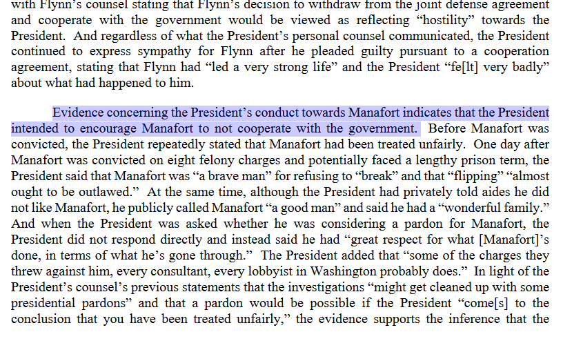 "Evidence concerning the President’s conduct towards Manafort indicates that the President intended to encourage Manafort to not cooperate with the government." (Volume II, p. 132)