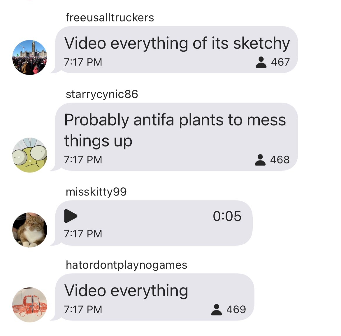 You could be looking at an antifa guy and not even know it! Where are all the semis? They can’t get in we are boxed in.