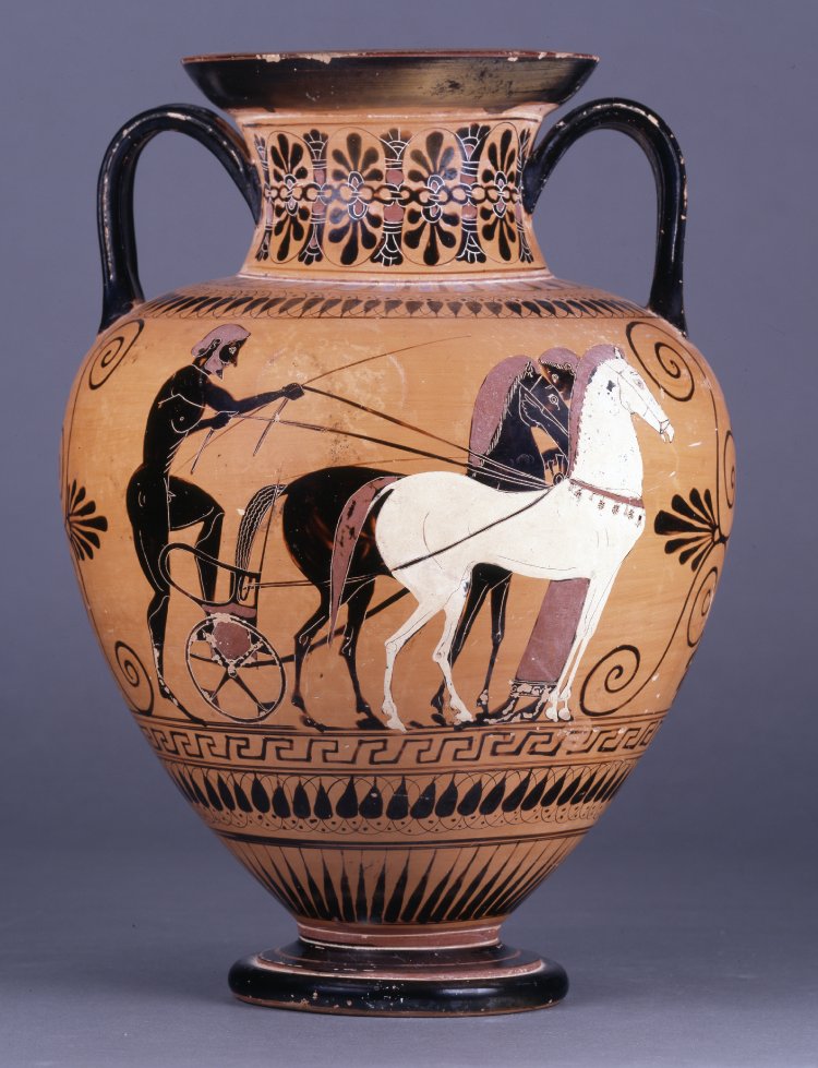 The above black-figure amphora depicts a charioteer readying for a synoris or two-horse chariot race ca. 500 BC at the British Museum [1]