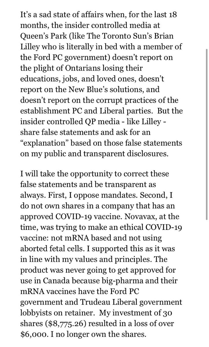 New Blue MPP Belinda Karahalios, who is currently barred from the legislature for 90 days for being unvaccinated and catching Covid, declared investment shares in Novavax Inc., a biopharma firm that develops and sells Covid vaccines.