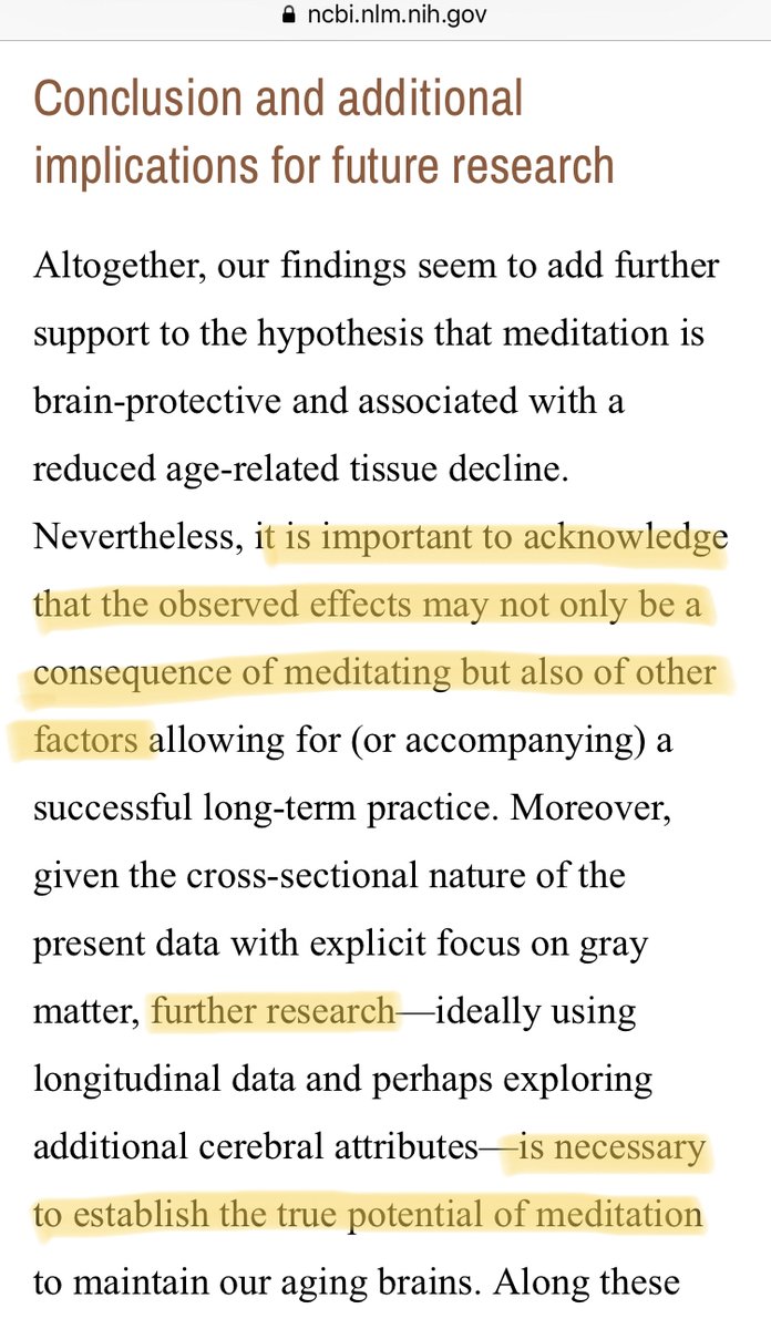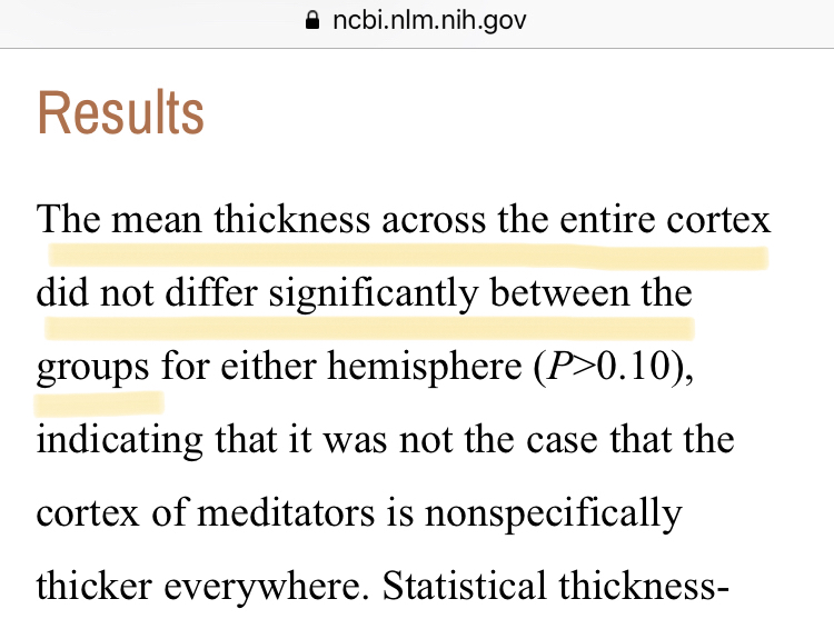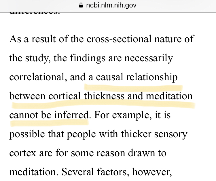 - Les auteurs relèvent que leurs résultats sont forcément de nature corrélationnels et qu’« une relation causale entre l'épaisseur du cortex et la pratique de la méditation ne peut pas être inférée. »