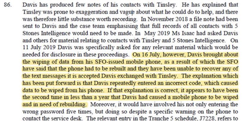 When Akle was originally tried, the SFO did not disclose these dealings or any other evidence of the frequent contact SFO staff had with Tinsley. Kevin Davies – the SFO’s Chief Investigator – ‘accidentally’ deleted his phone data, for the second time in less than a year. 4/9