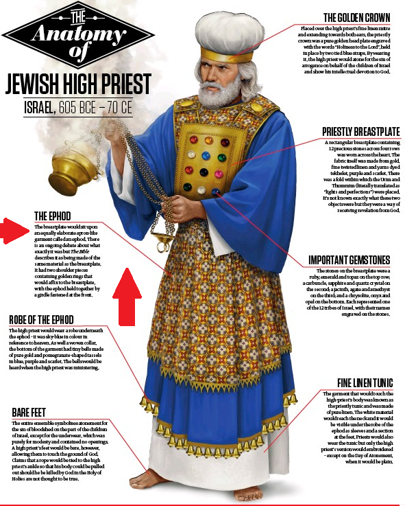 En Éxodo 28, 31 se nos dice que el sumo sacerdote debía cubrir su cuerpo con el efod, un manto que os he destacado en la ilustración.