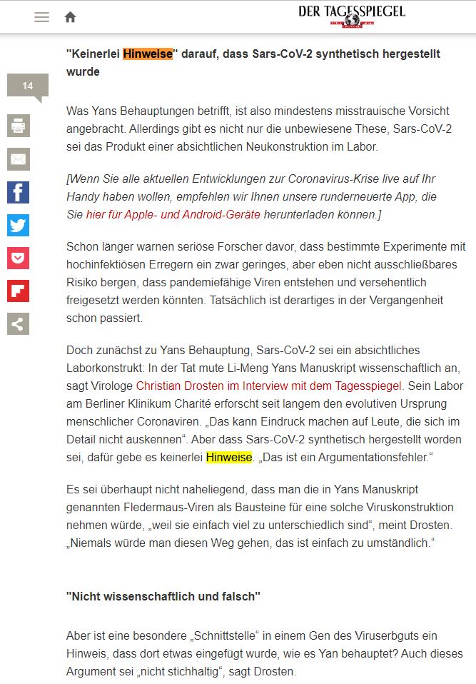 Sept. 20 sagte Drosten dem tagesspiegel: Es gebe "Keinerlei Hinweise" darauf, dass Sars-CoV-2 synthetisch hergestellt wurde.