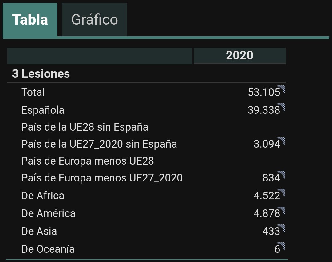🔍De 53105 lesiones, 39.338 (74%) los cometen españoles y 13.767 (26%) extranjeros.