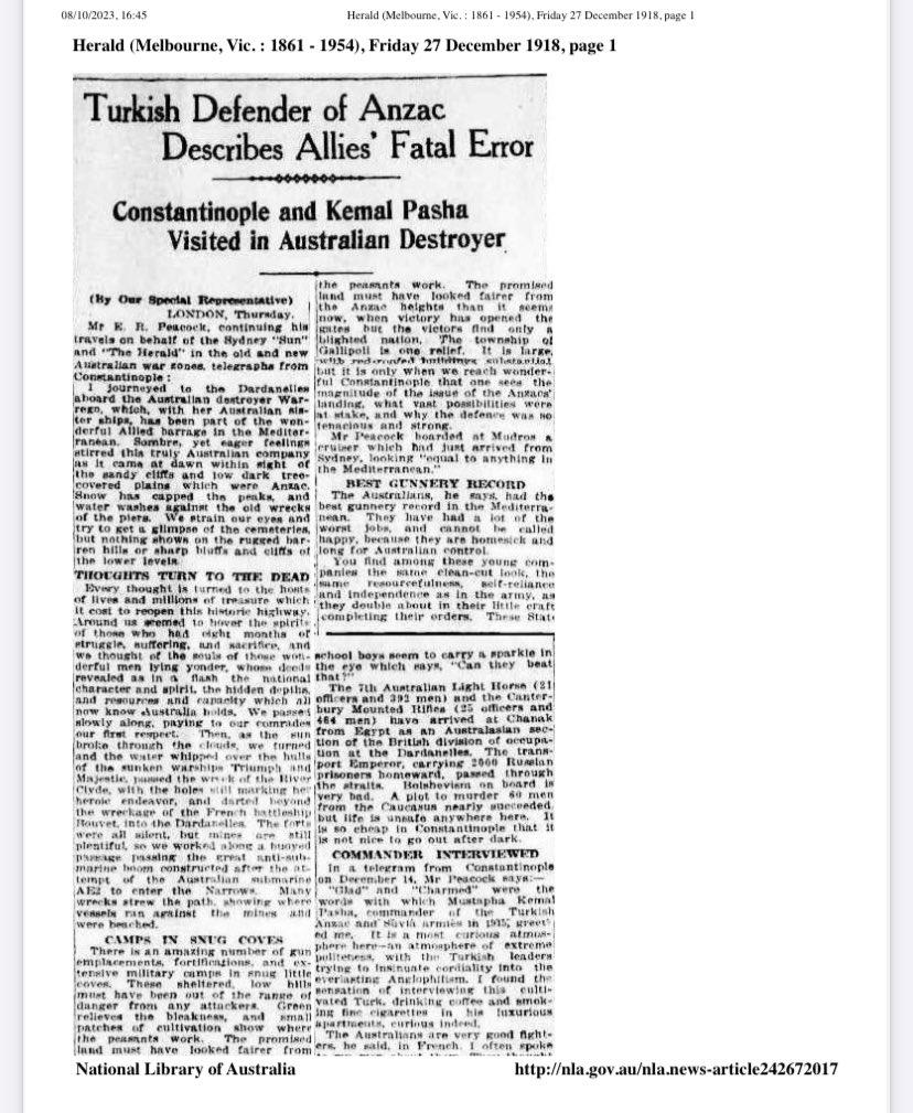 Mustafa Kemal’in Milli Mücadele öncesinde bile saygın ve önemli bir asker olarak Avustralya basınında itibar gördüğünün ispatı bu. Ayrıca Çanakkale'de sıradan bir albay değil savaşın seyrini değiştiren bir komutan olduğunun da somut örneği.