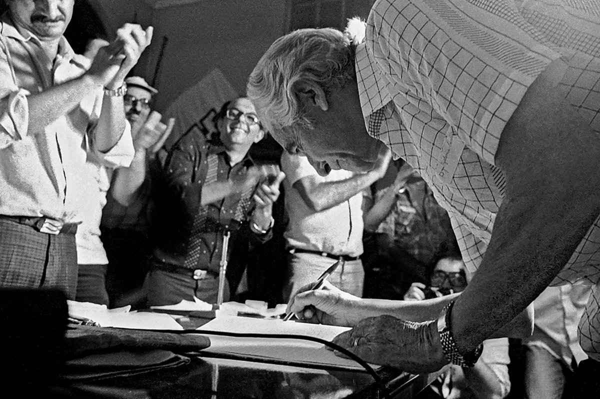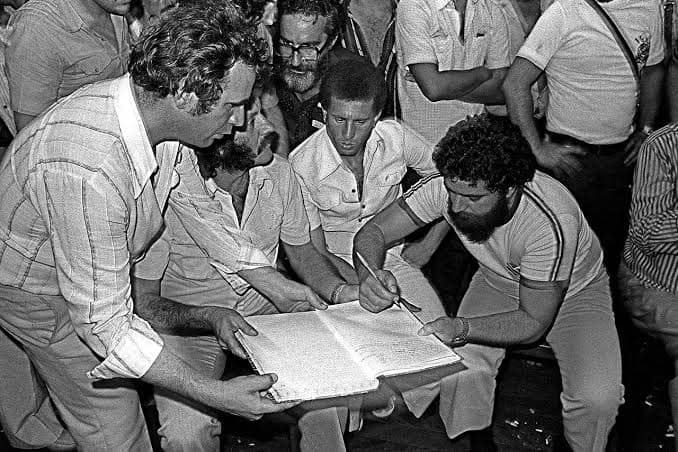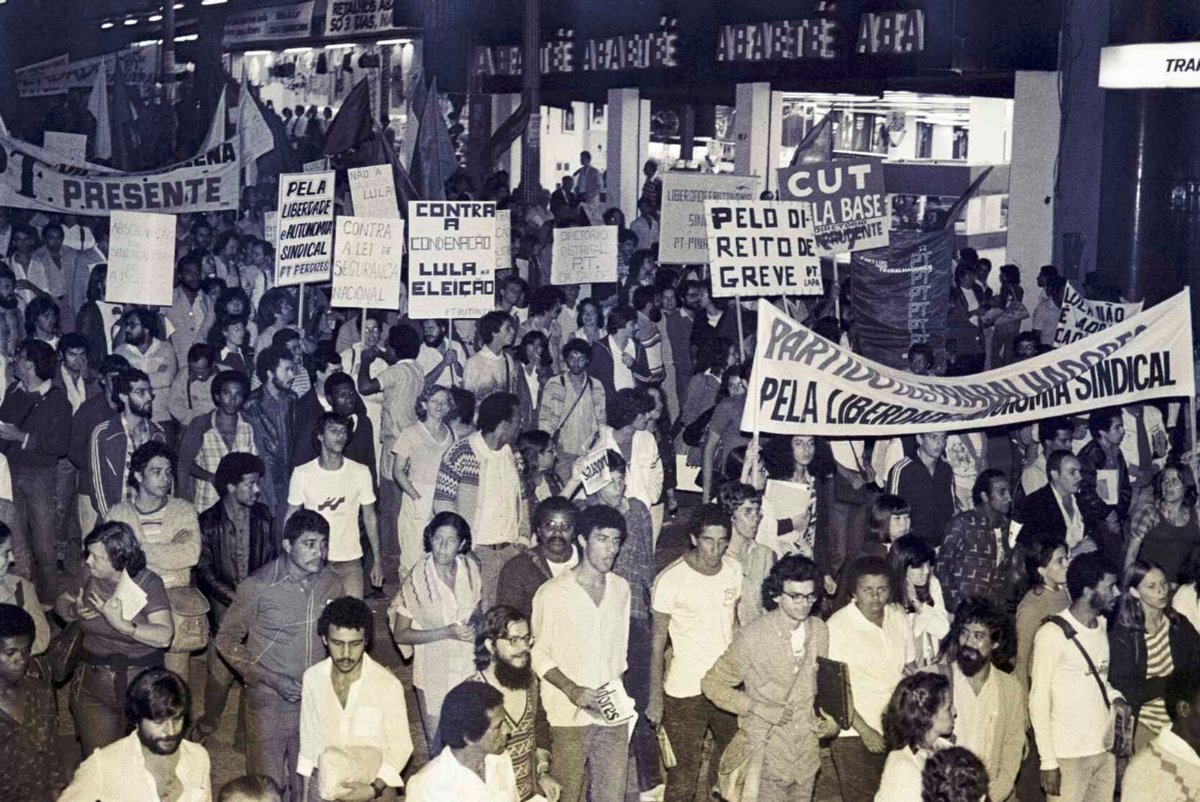 Luiz Inácio Lula da Silva presidindo o ato de fundação do Partido dos Trabalhadores (PT). O partido foi fundado há 42 anos, em 10 de fevereiro de 1980, em uma cerimônia realizada no auditório do Colégio Sion, em São Paulo.