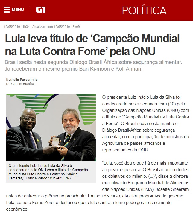 Lula foi agraciado pela ONU com o título de "campeão mundial da luta contra a fome". Reeleito em 2006, implementou programas que permitiram quadruplicar o ingresso de jovens no ensino superior, ampliar os empregos formais e combater o déficit habitacional.