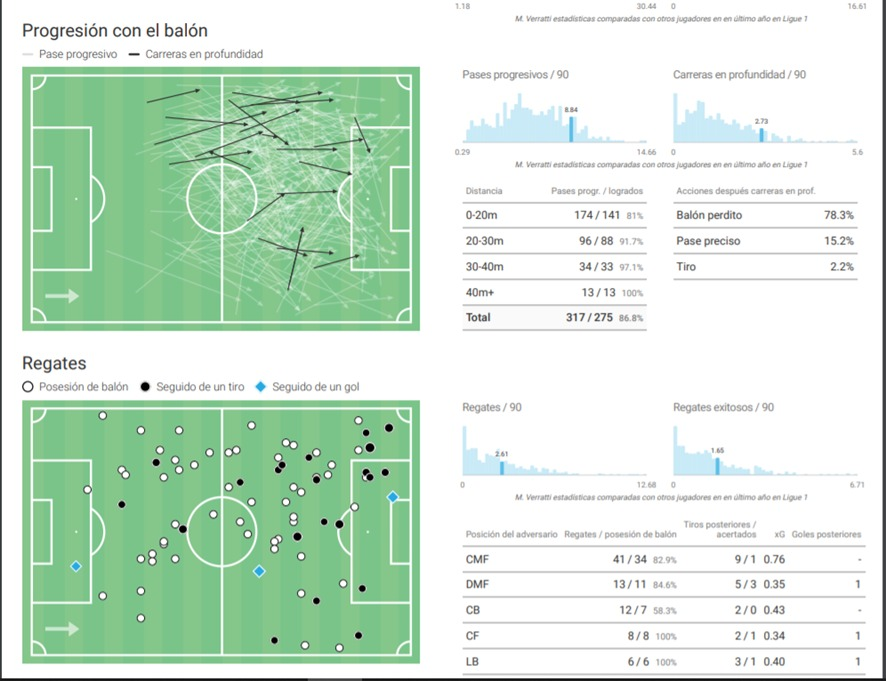 Os paso dos estadísticas de Verratti para que veáis que es un box to box total. Sus progresiones con balón tienden a realizarse en la izquierda, que es donde le utiliza Pochettino para atraer siempre al extremo rival. En regates aparece por todo el campo. Completísimo.