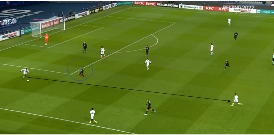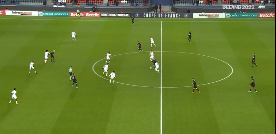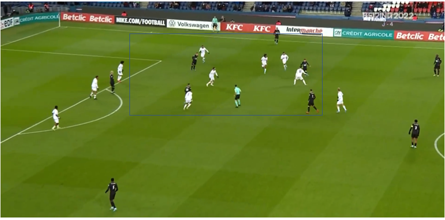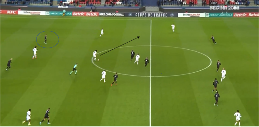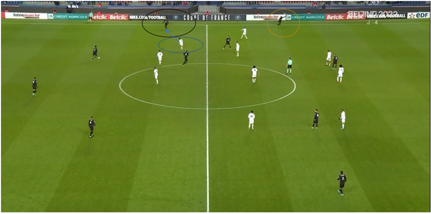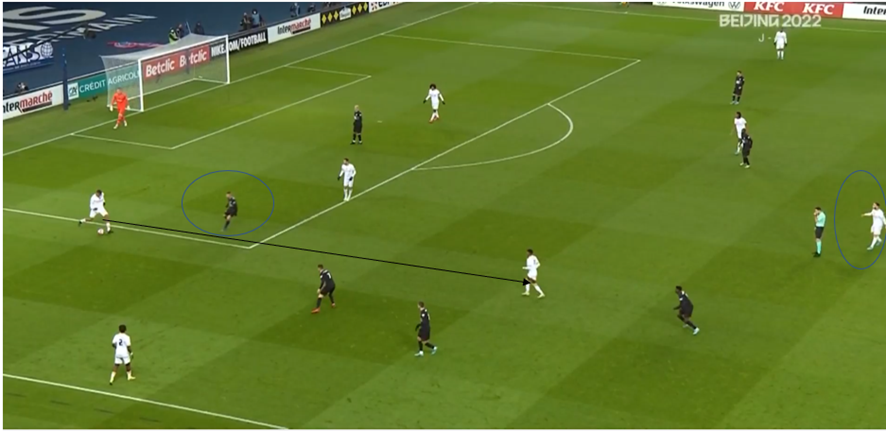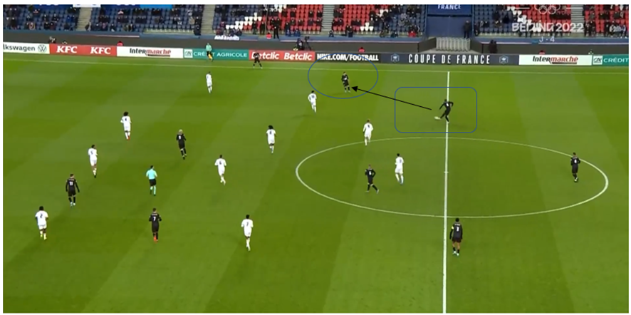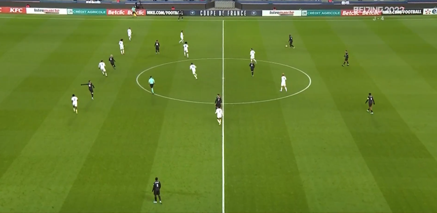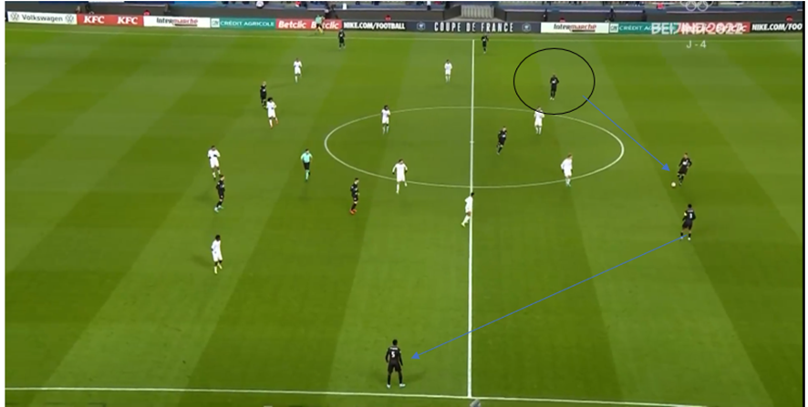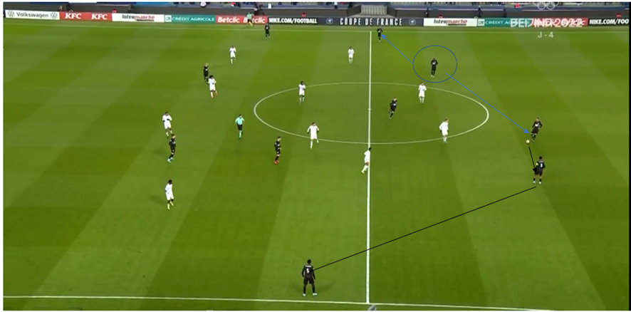 Verratti entiende el fútbol como pocos. Su presencia en la izquierda, ya sea para atraer al extremo (dos primeras imágenes) y dar amplitud con Nuno o, para aparecer a espalda del extremo derecho cuando saltan a Kimpembe, es clave. El italiano es buenísimo para atraer.